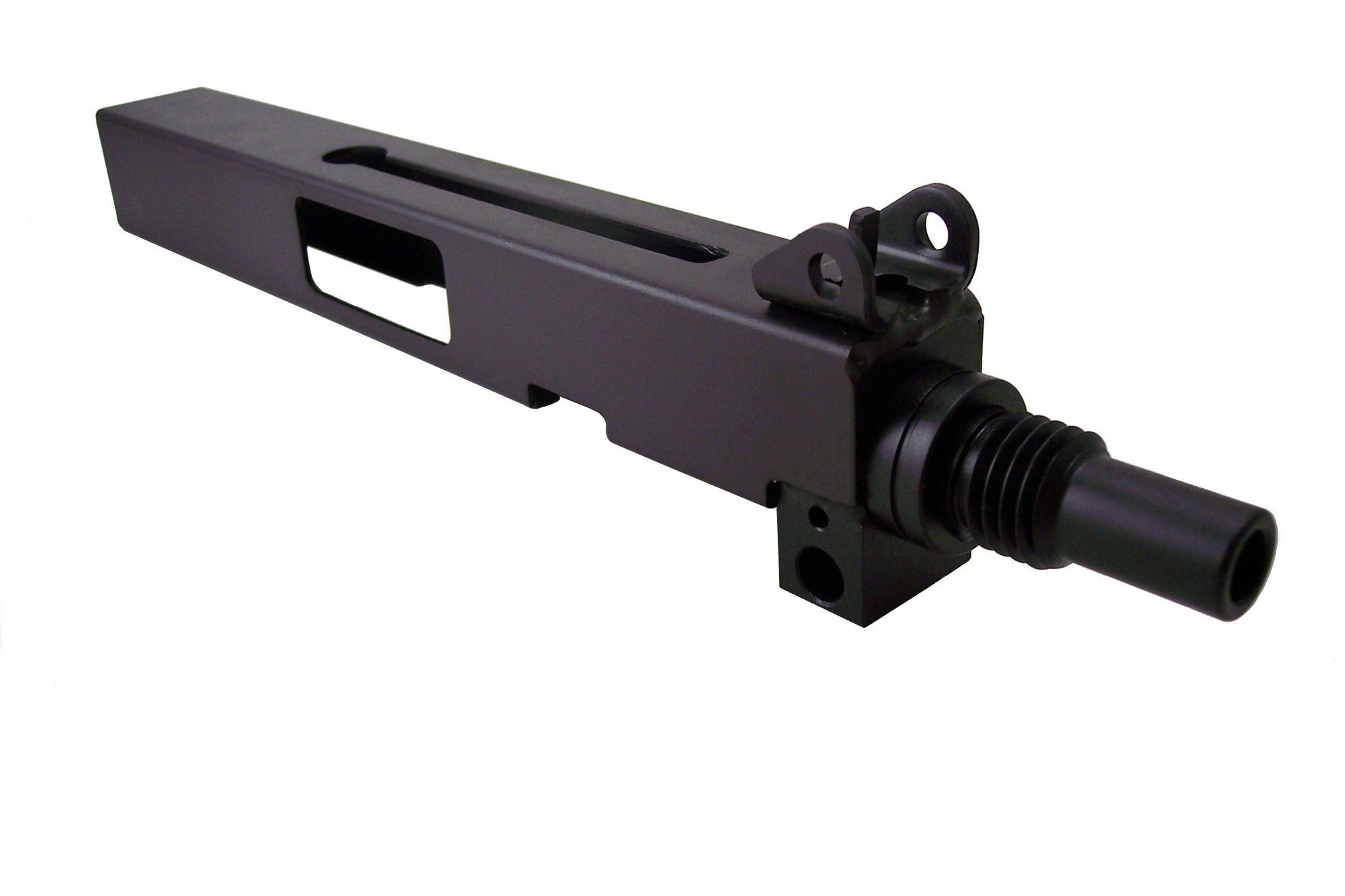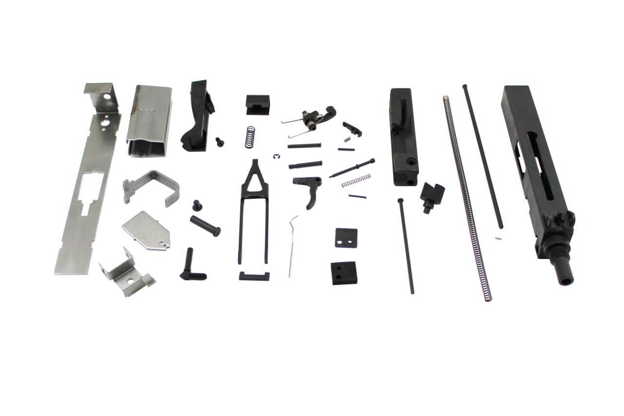 This is a FACTORY NEW VMAC9 Top Cocking Pistol Kit manufactured by Velocity Firearms. This kit includes everything you need to complete a pistol minus the receiver side plates and Sten Gun Mag. The side plate prints will be included. The VMAC is a descendant of the famous Military Armament Corporation machine pistol manufactured in the early 1980′s. Like the MAC 11 they are made of a formed sheet metal lower receiver containing the trigger mechanism and square tube upper receiver, housing the barrel and bolt assembly. The barrel has a thread size of 3/4 X 10 for any accessories you may want. The magazine is well incorporated in the pistol grip. It uses the blow-back unlocked bolt design.