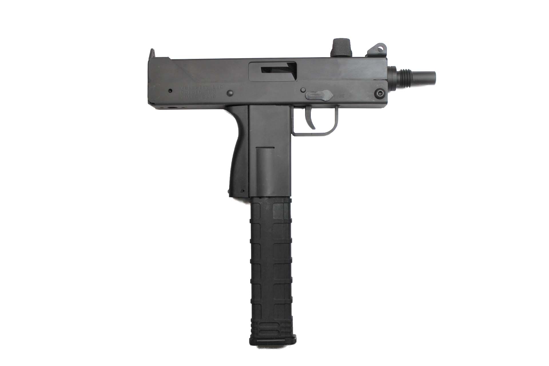 This is a FACTORY NEW VMAC9 manufactured by Velocity Fire Arms. This is a package deal including the pistol with one 30 Round Sten Gun Mag, manual, and trigger lock. The VMAC9 is a descendant of the famous Military Armament Corporation machine pistol manufactured in the early 1980’s. Like the MAC 11 they are made of a formed sheet metal lower receiver containing the trigger mechanism and square tube upper receiver, housing the barrel and bolt assembly. The barrel has a thread size of ¾ x 10 for any accessories you may want. The magazine is well incorporated in the pistol grip. It uses the blow-back unlocked bolt design. All parts have a manganese phosphate finished IAW 5.3.1.2 of Mil-STD-171, the U. S. governments recommended protective finish for steel.